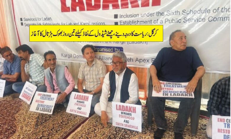 کرگل: بھارت کے غیر قانونی زیر قبضہ جموں وکشمیر کے خطے کرگل میں آج صبح تین روزہ بھوک ہڑتال کا آغاز ہوا جسکا مقصد ریاست کا درجہ دینے اور بھارتی آئین کے چھٹے شیڈول کے نفاذ کے مطالبات پر زور دینا ہے۔