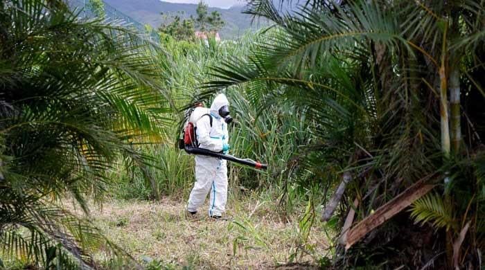ایک آرس ویکٹر کنٹرول ایجنٹ 22 اپریل ، 2025 کو فرانسیسی بیرون ملک لا ری یونین کے سینٹ بینوئٹ میں مچھروں کے ذریعہ چکنگونیا وبائی امراض کے خلاف لڑائی کے ایک حصے کے طور پر کام کرتا ہے۔-اے ایف پی۔