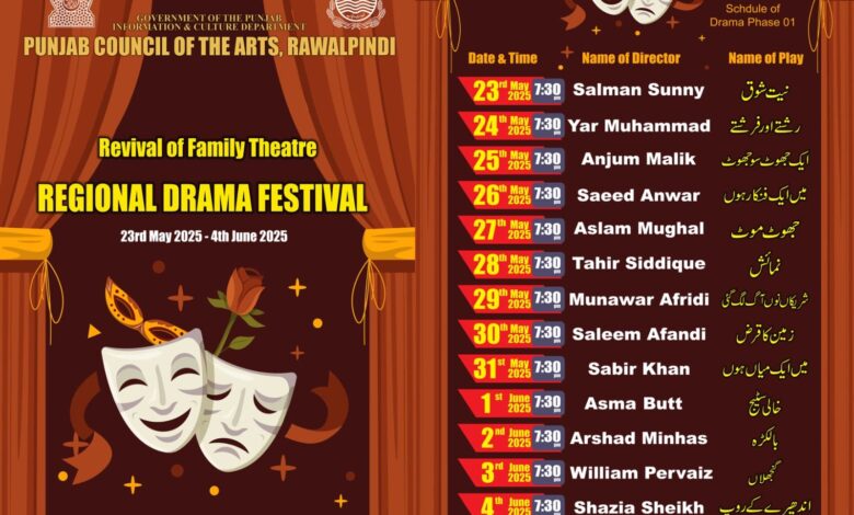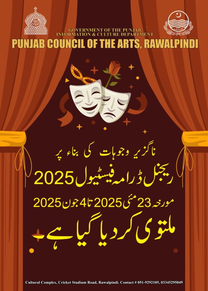 23 مئی تا 4 جون آج سے شروع ہونے والا ریجنل ڈرامہ فیسٹیول ملتوی کر دیا گیا ہے ۔